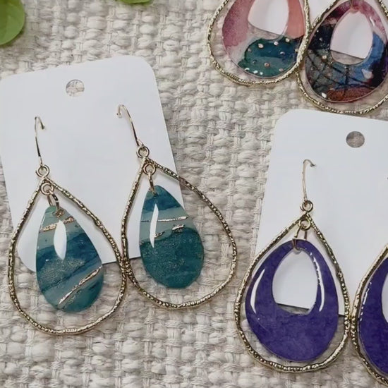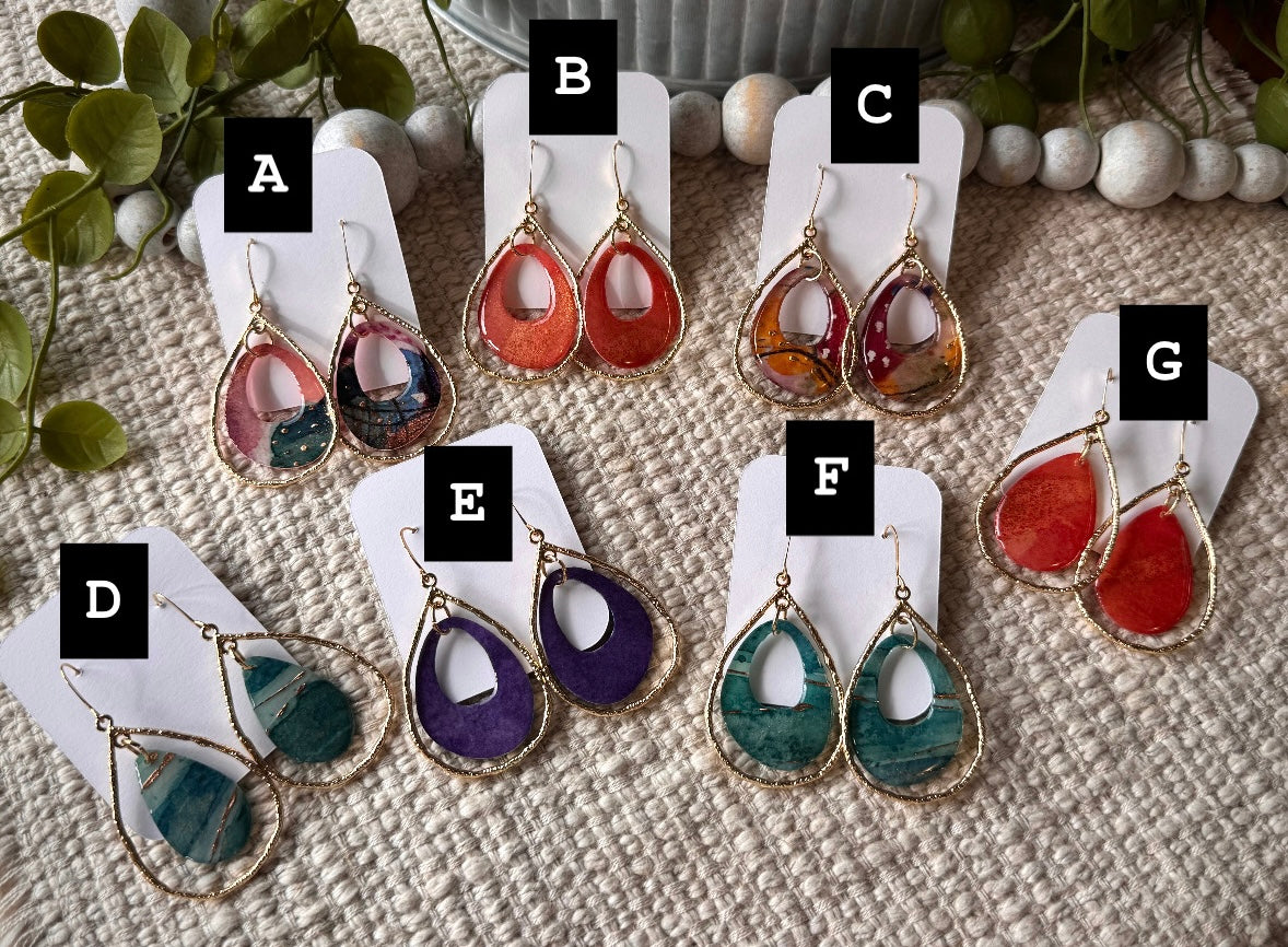 Featuring bold washes of autumn tones—burnt orange, deep plum, forest teal, and rich cranberry—these earrings capture the vibrant beauty of the season. The hammered gold edges catch the light with every movement, making them a perfect blend of artistic charm and everyday sophistication.