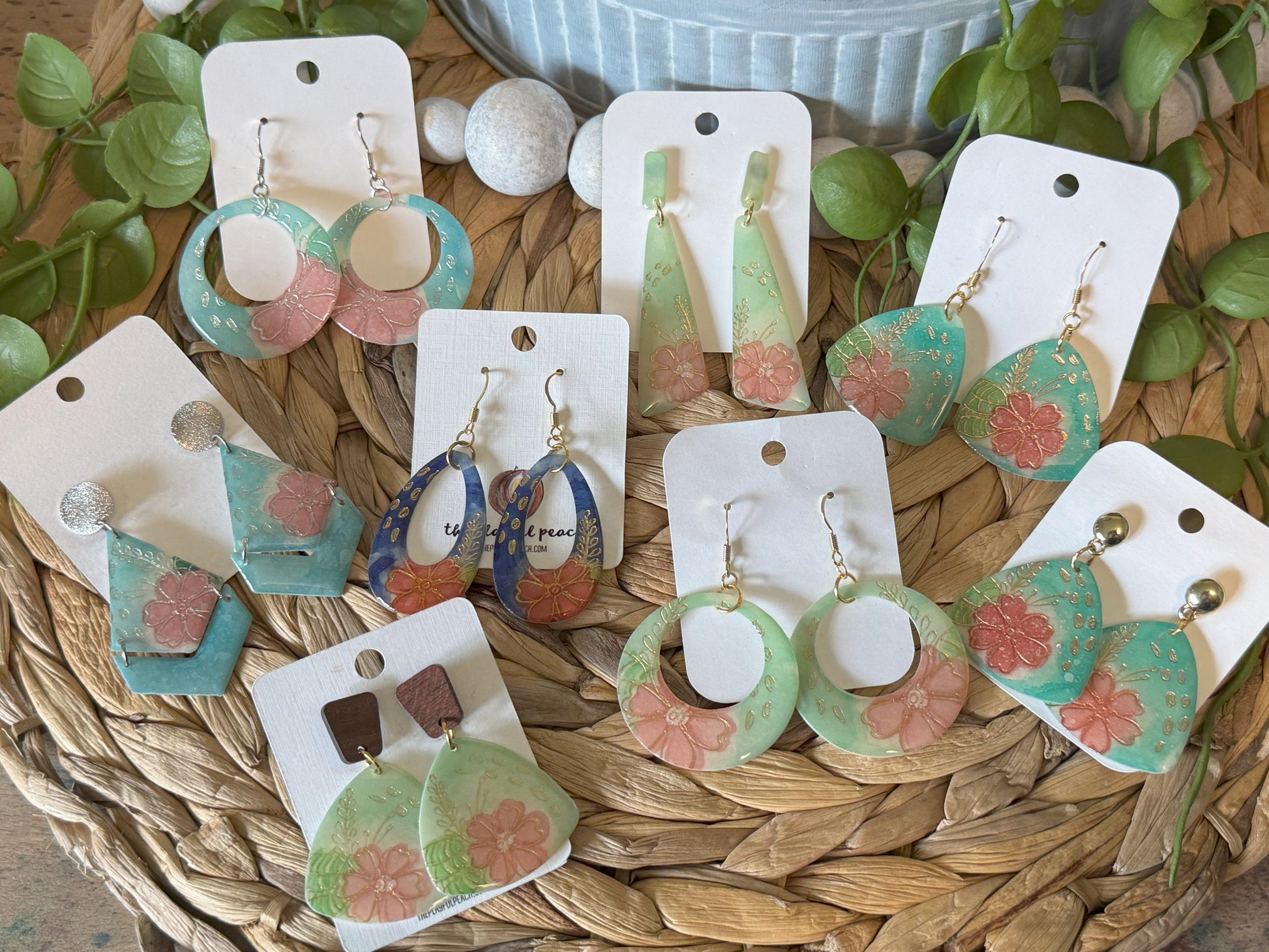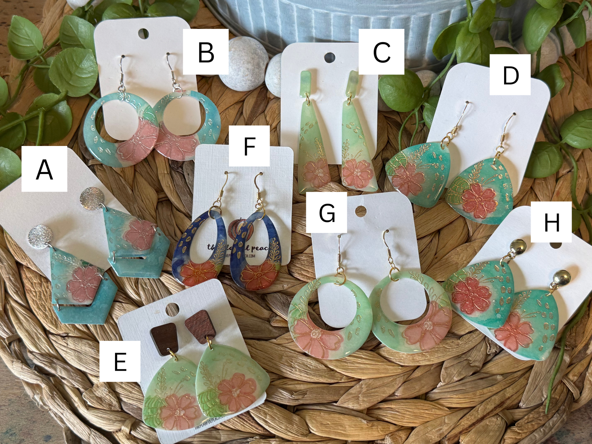 Original, hand painted watercolor paintings finished in resin. Nickel free and hypoallergenic metals.