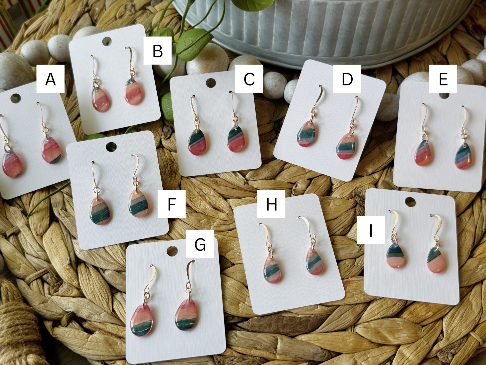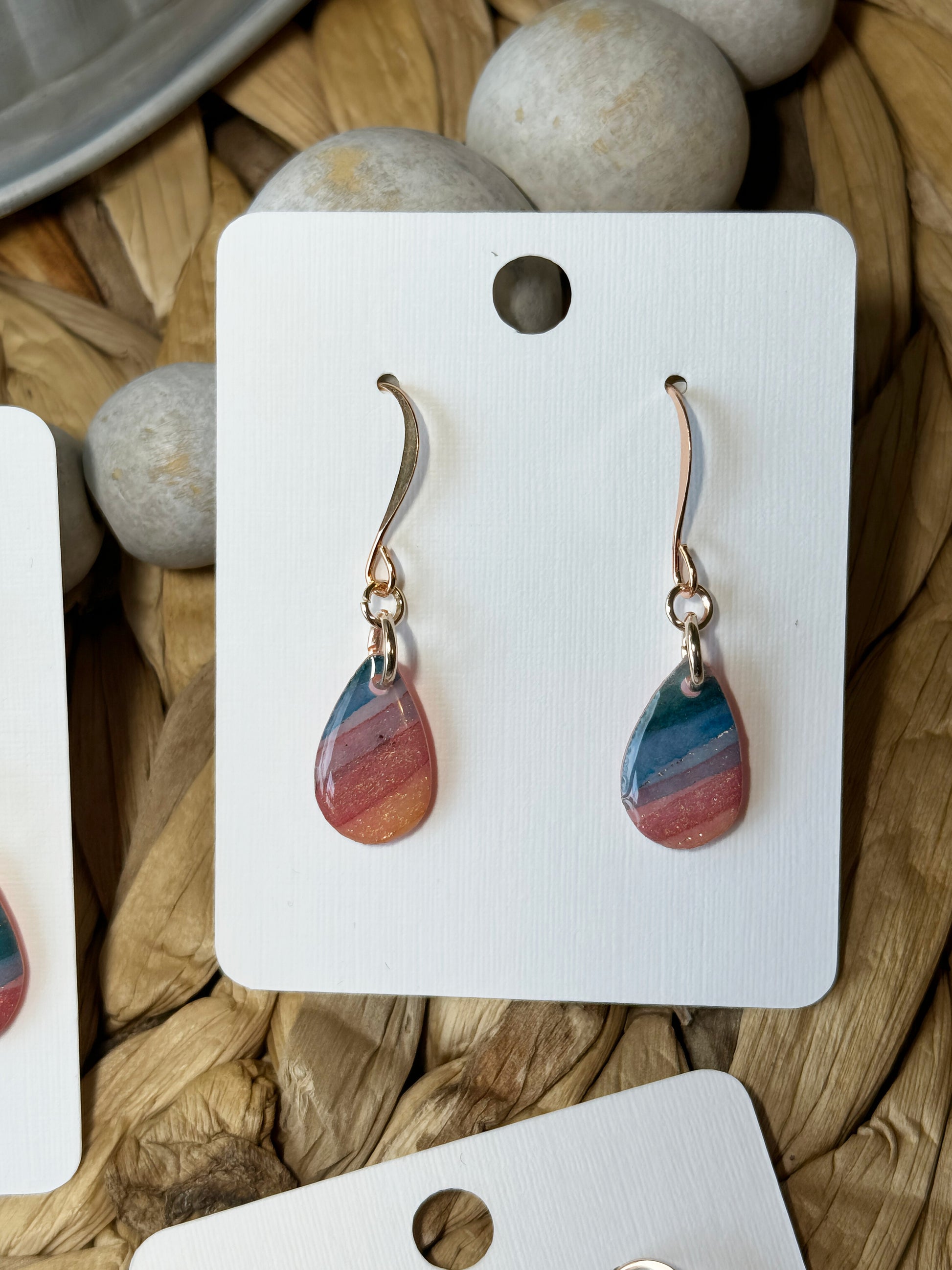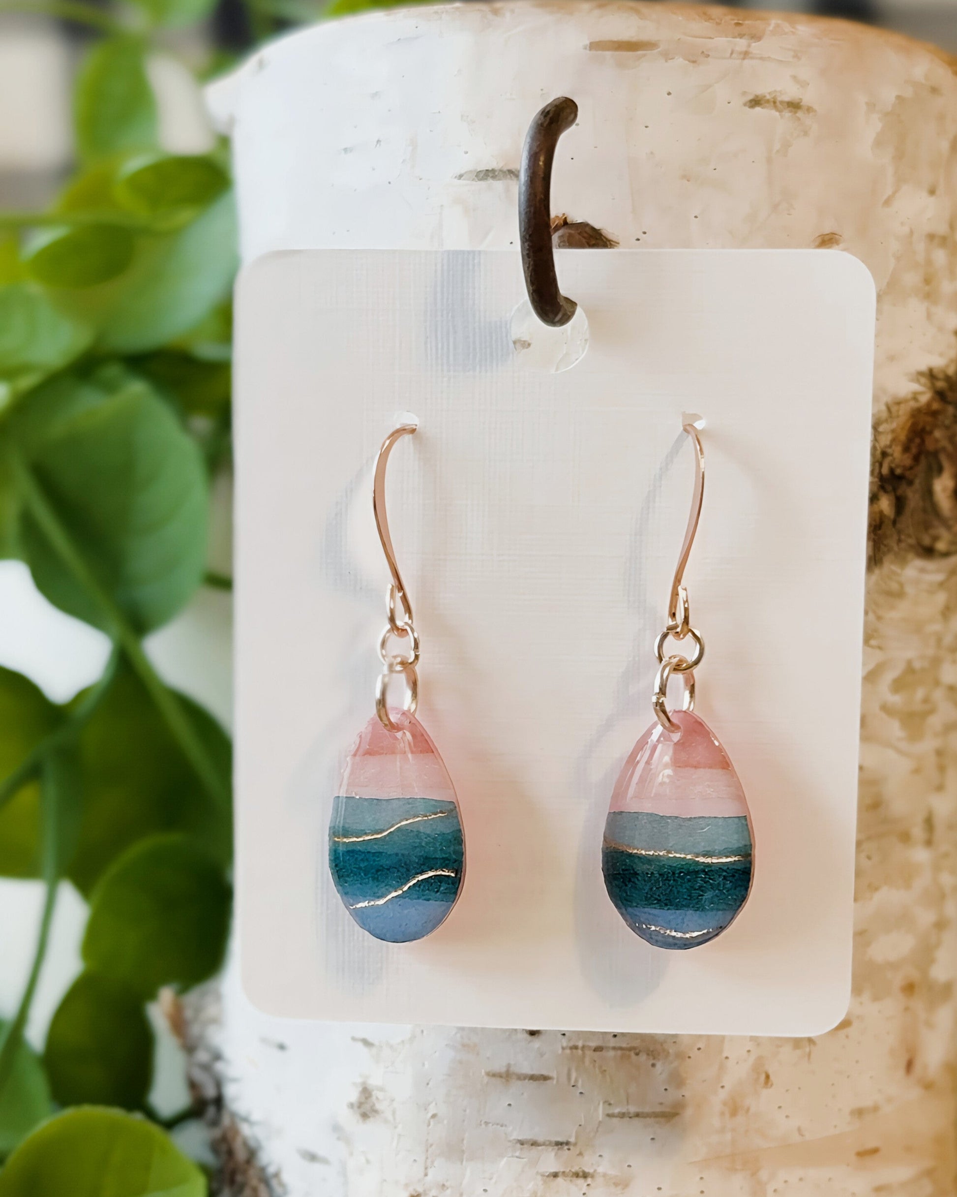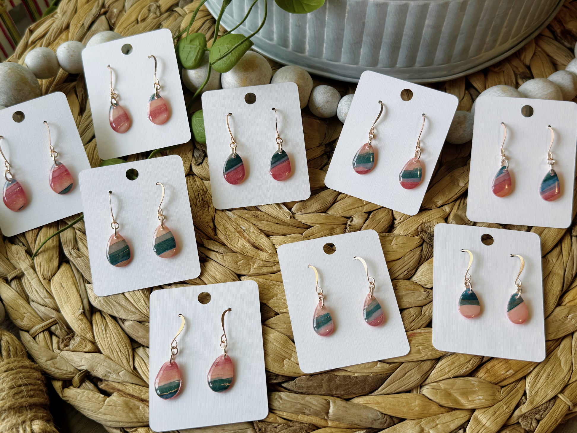 Soft coastal color in a smaller size. These mini dangles were inspired by coquina shells—layered, sun-washed, and full of quiet detail. Light, easy to wear, and painted by hand.