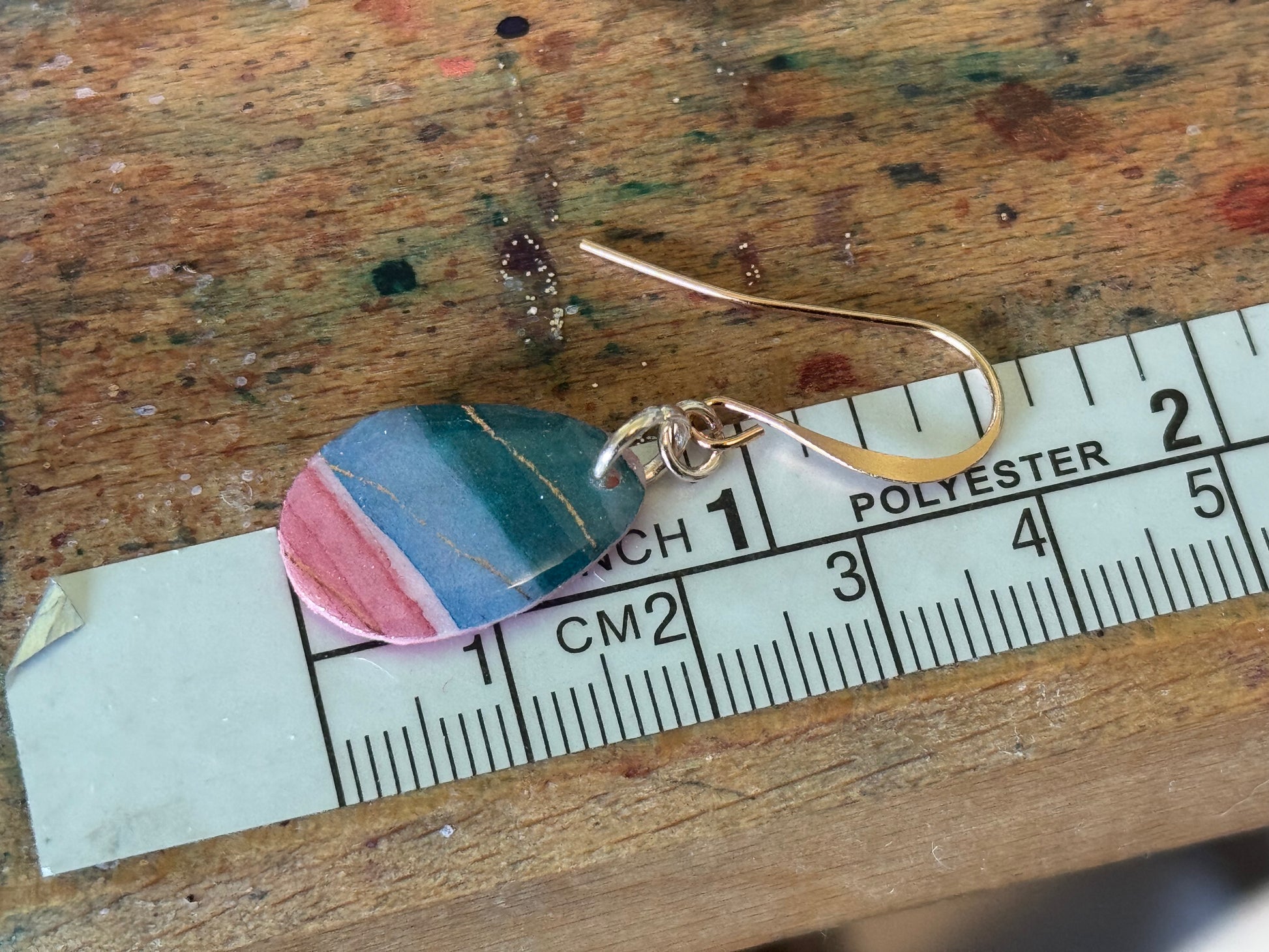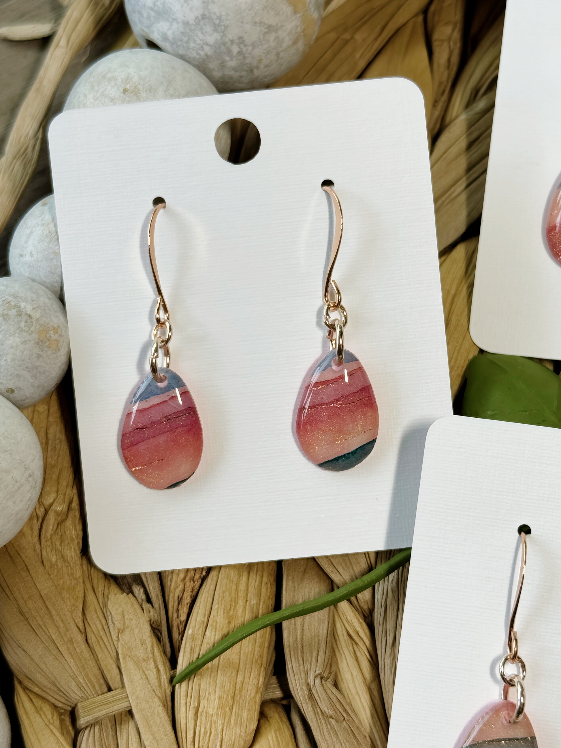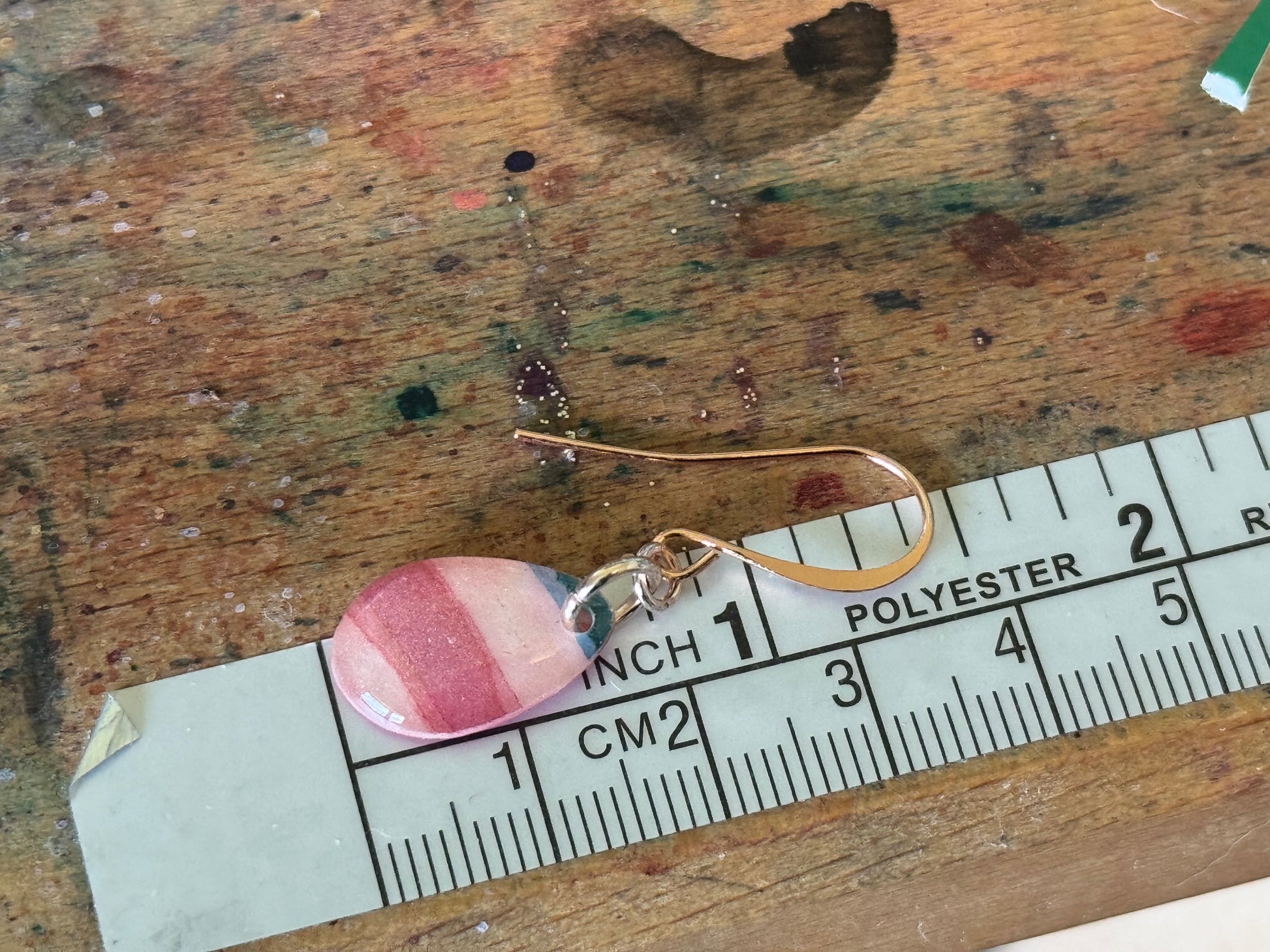 Soft coastal color in a smaller size. These mini dangles were inspired by coquina shells—layered, sun-washed, and full of quiet detail. Light, easy to wear, and painted by hand.