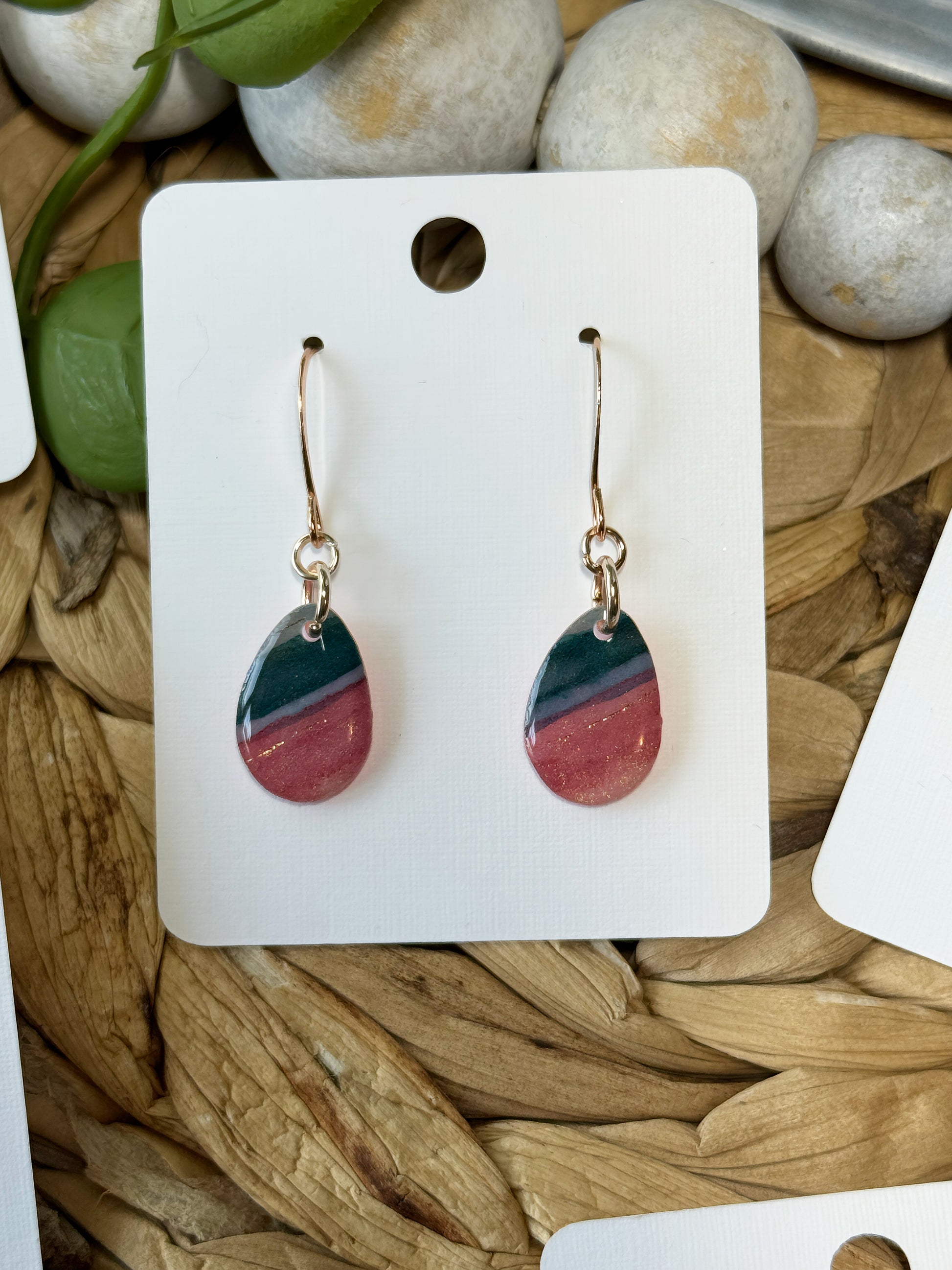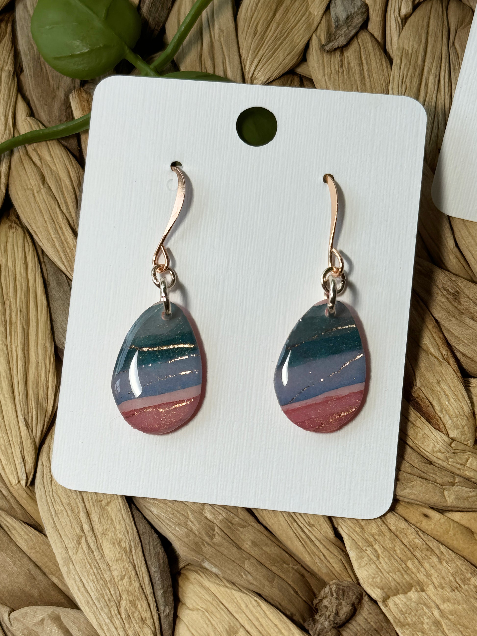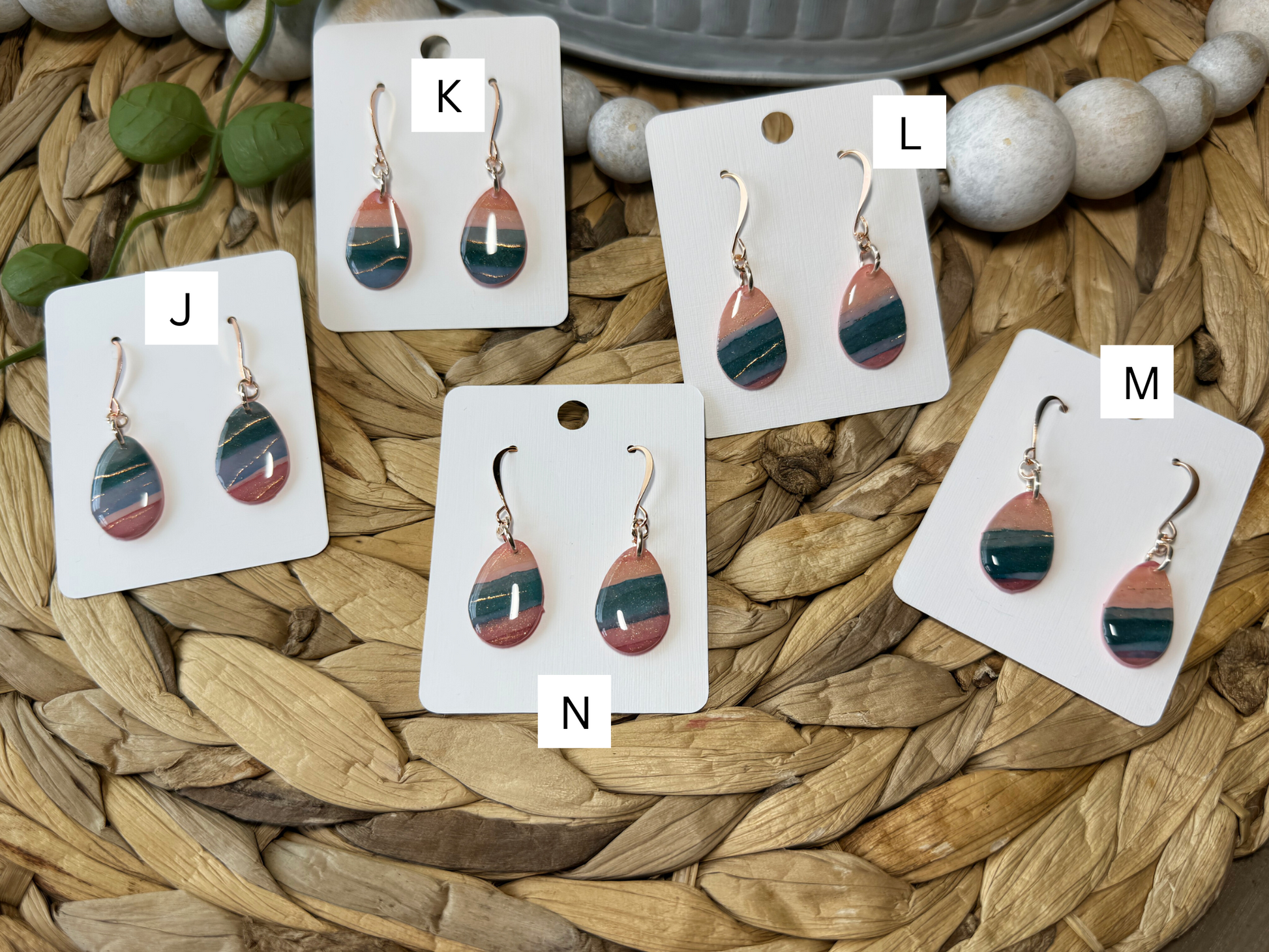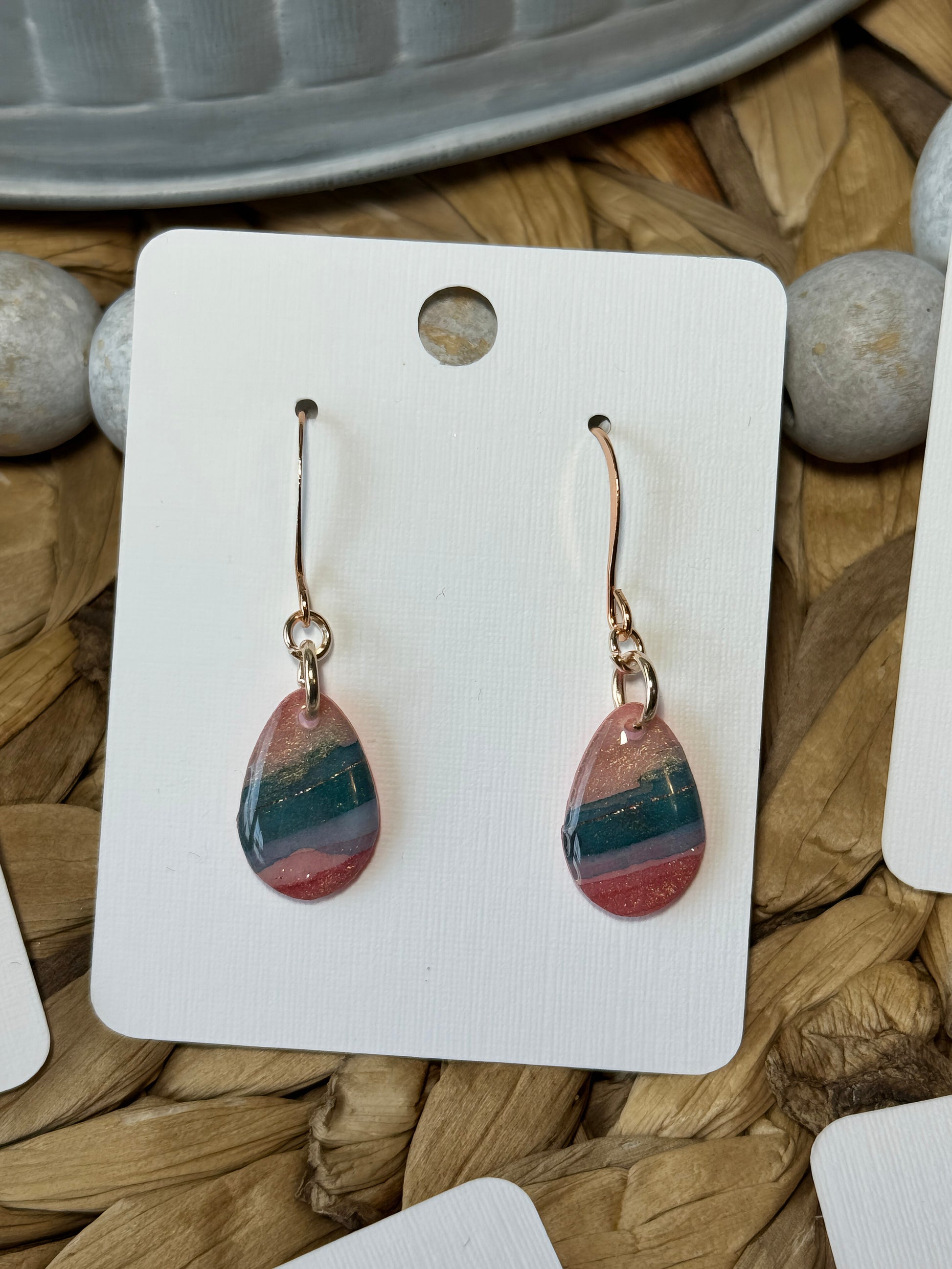 Soft coastal color in a smaller size. These mini dangles were inspired by coquina shells—layered, sun-washed, and full of quiet detail. Light, easy to wear, and painted by hand.