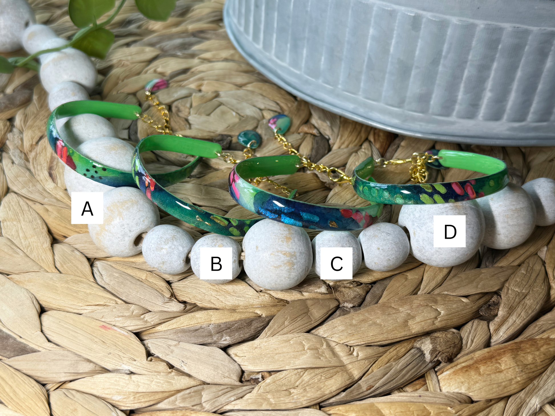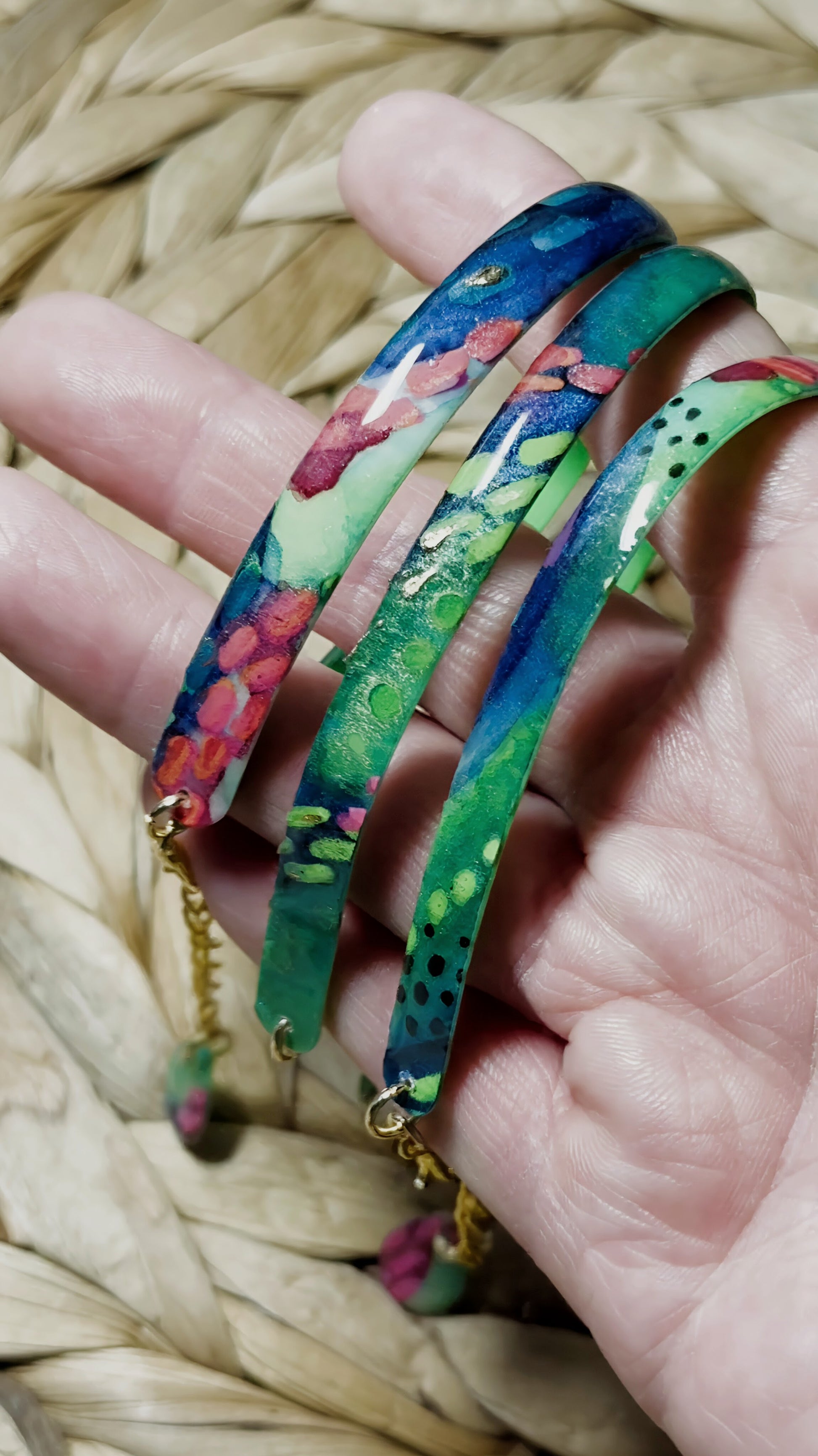 Bright, layered color with a little pop —these bangles were painted with dragon fruit in mind.