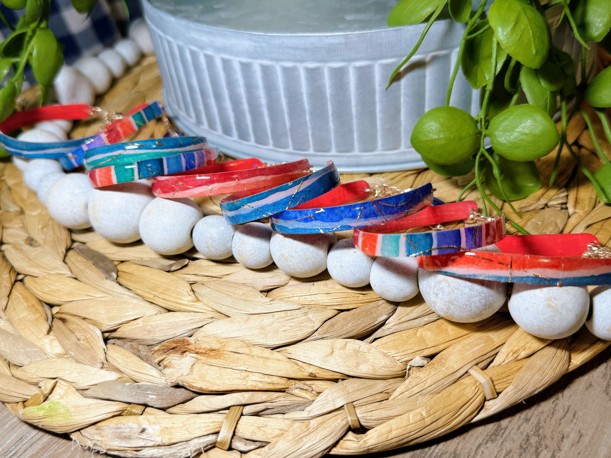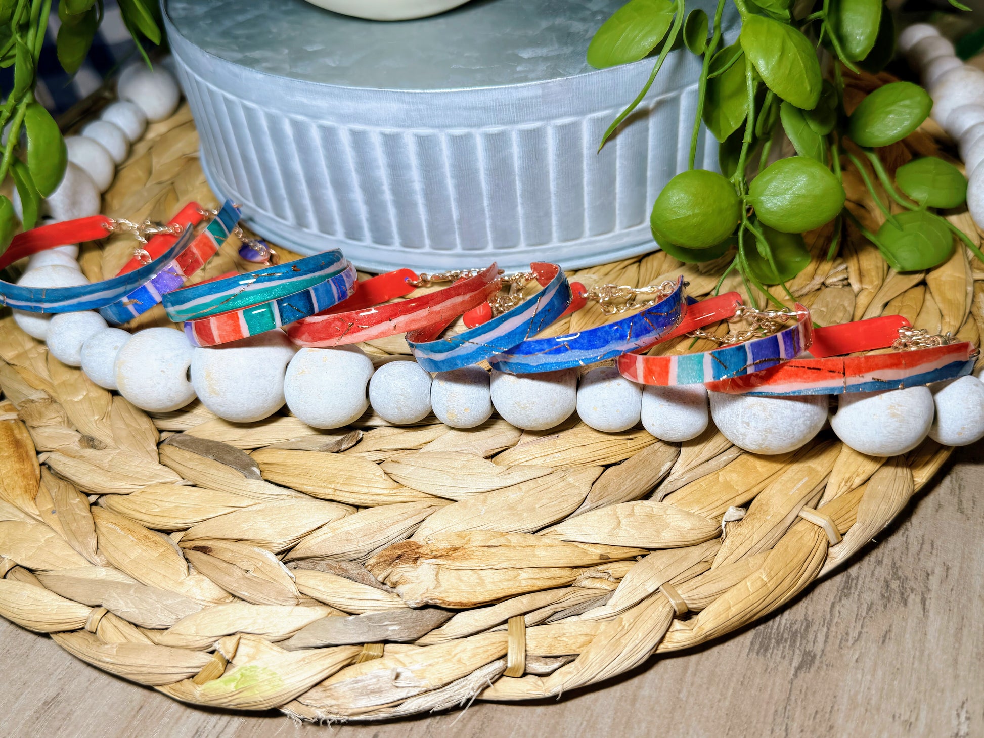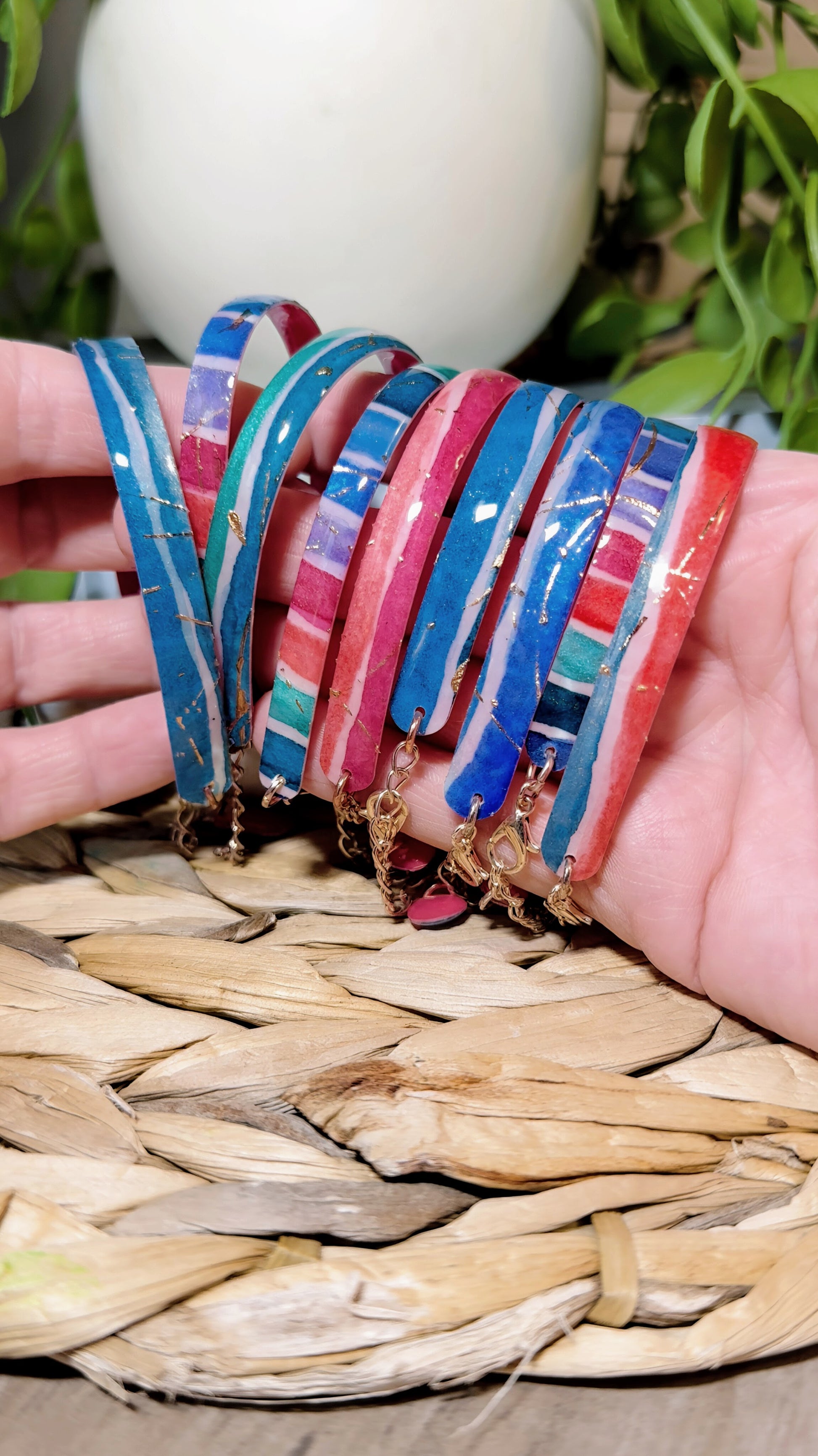 Bright, layered color with a little pop —these bangles were painted with fun and bright colors in mind.