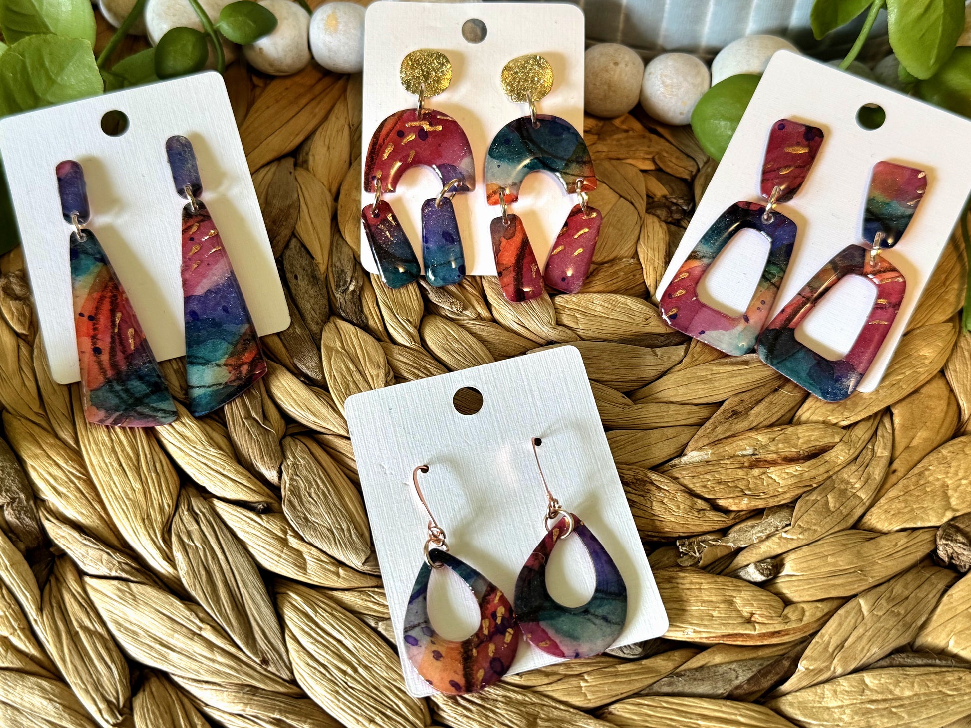 Original, hand painted watercolor paintings finished in resin. Nickel free and hypoallergenic metals.