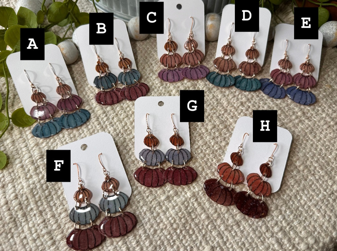 Layered in rich fall shades—pumpkin orange, cranberry, deep plum, misty blue, and more—these earrings stack three whimsical pumpkins in a playful cascade. They’re lightweight, eye-catching, and perfect for everything from pumpkin patch outings to cozy fall gatherings.