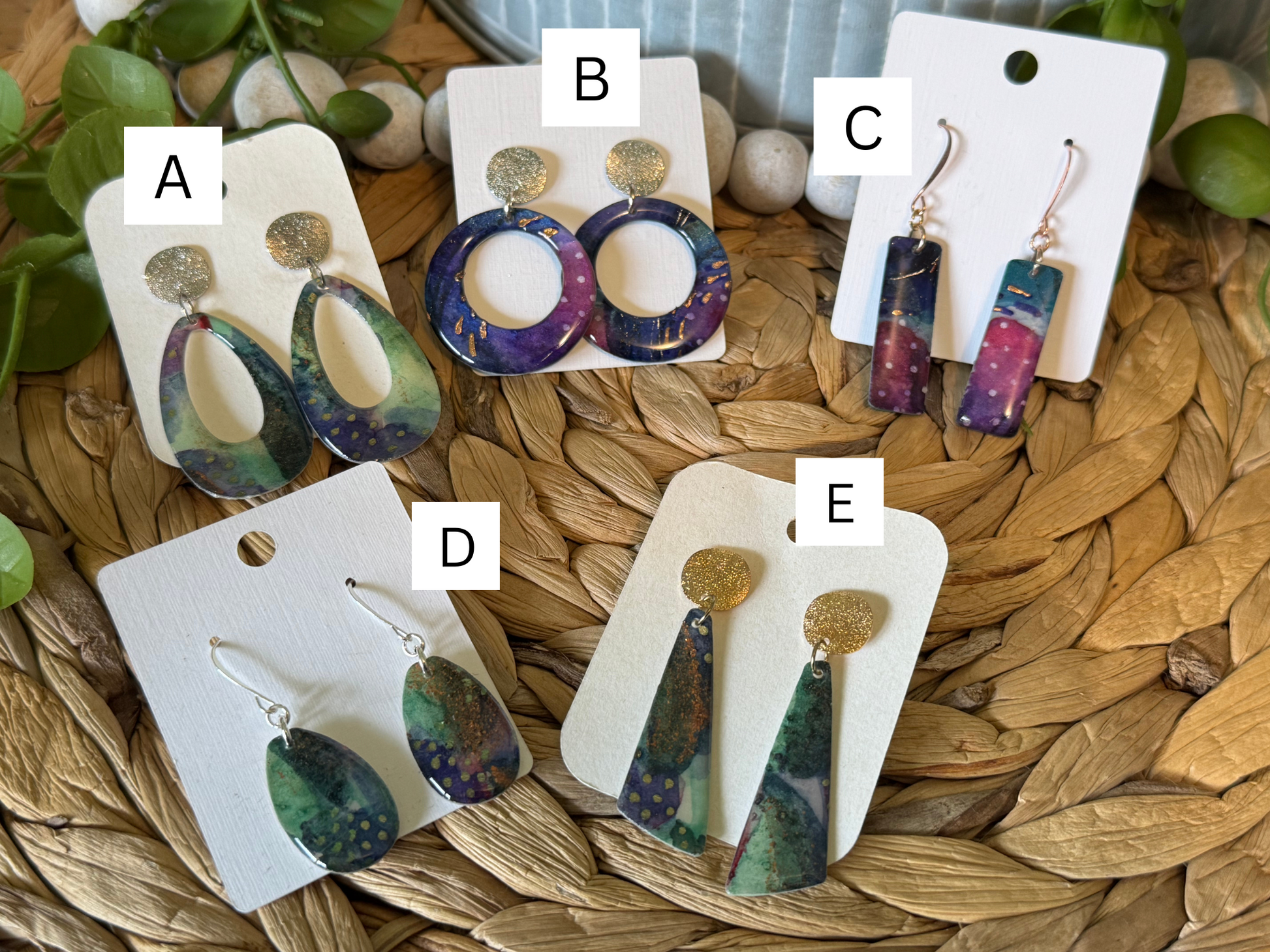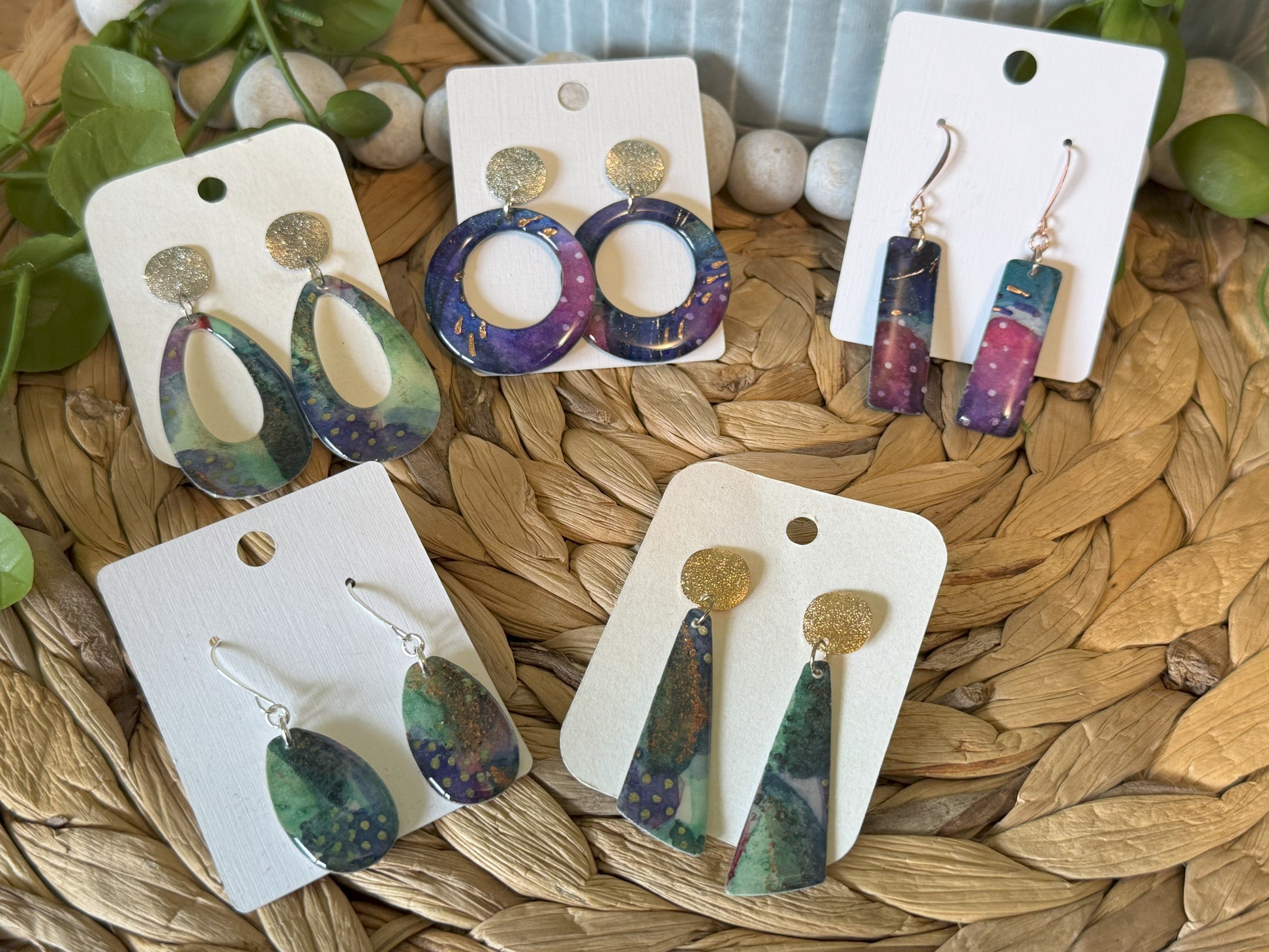Original, hand painted watercolor paintings finished in resin. Nickel free and hypoallergenic metals.
